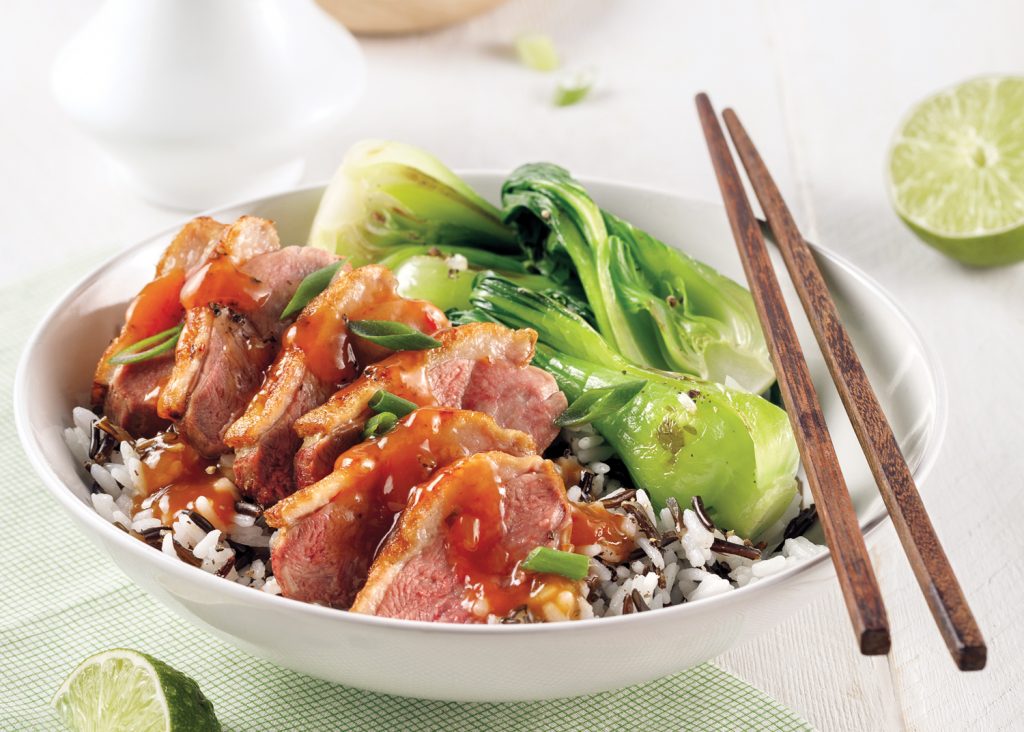 Divide the sliced duck meat and mini bok choys among the plates and pour the sauce over the duck. Serve with rice, if desired.