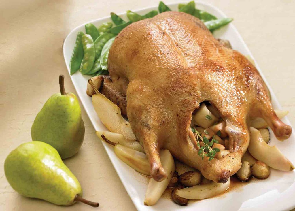 2. Remove giblets from cavity, rinse duck under cold water, sponge dry and set aside. Cut two pears into large pieces and place them in the duck’s cavity.