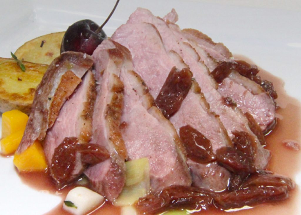 Meanwhile, warm the sauce on low heat. Slice the duck breasts and place them in the sauce. Serve with the following suggested side dishes: butternut squash cubes sautéed in duck fat with thyme, buttered leek confit and potatoes roasted in duck fat with rosemary and Espelette pepper.