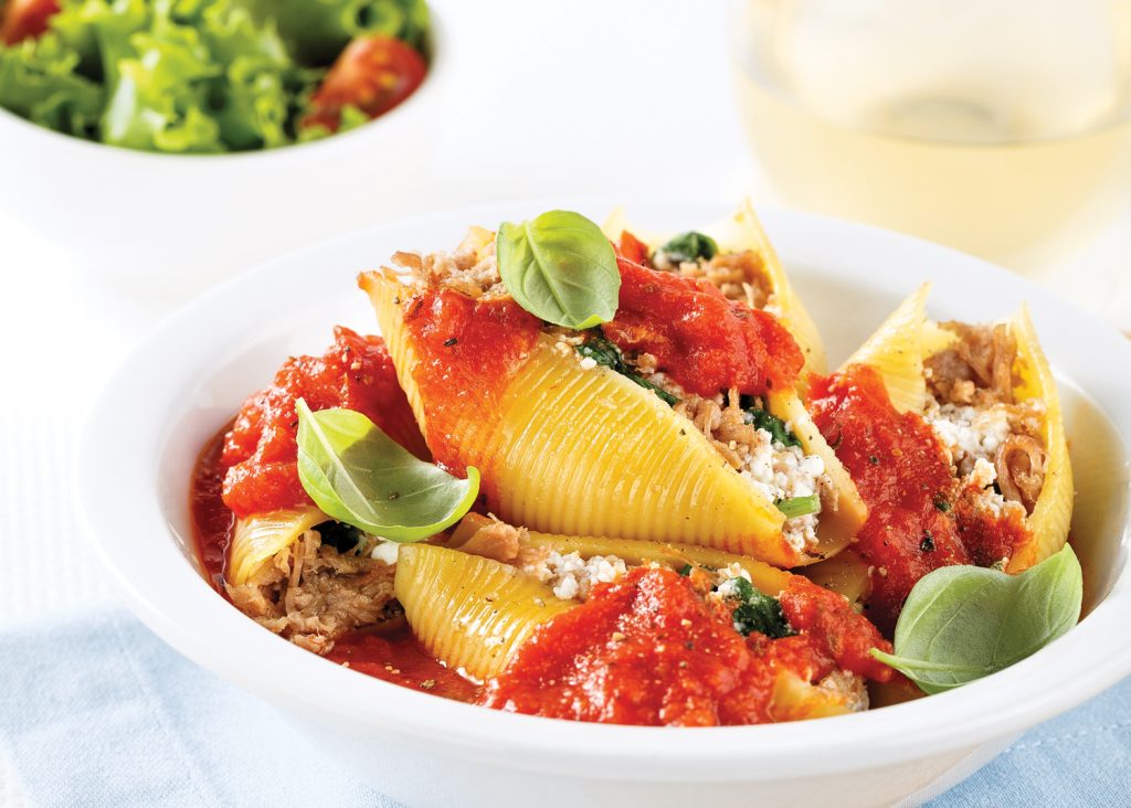5. Spread some of the marinara sauce over the bottom of a 33 cm x 23 cm (13 in. X 9 in.) baking dish. Lay the shells side by side in the dish. Cover the shells with the rest of the marinara sauce.