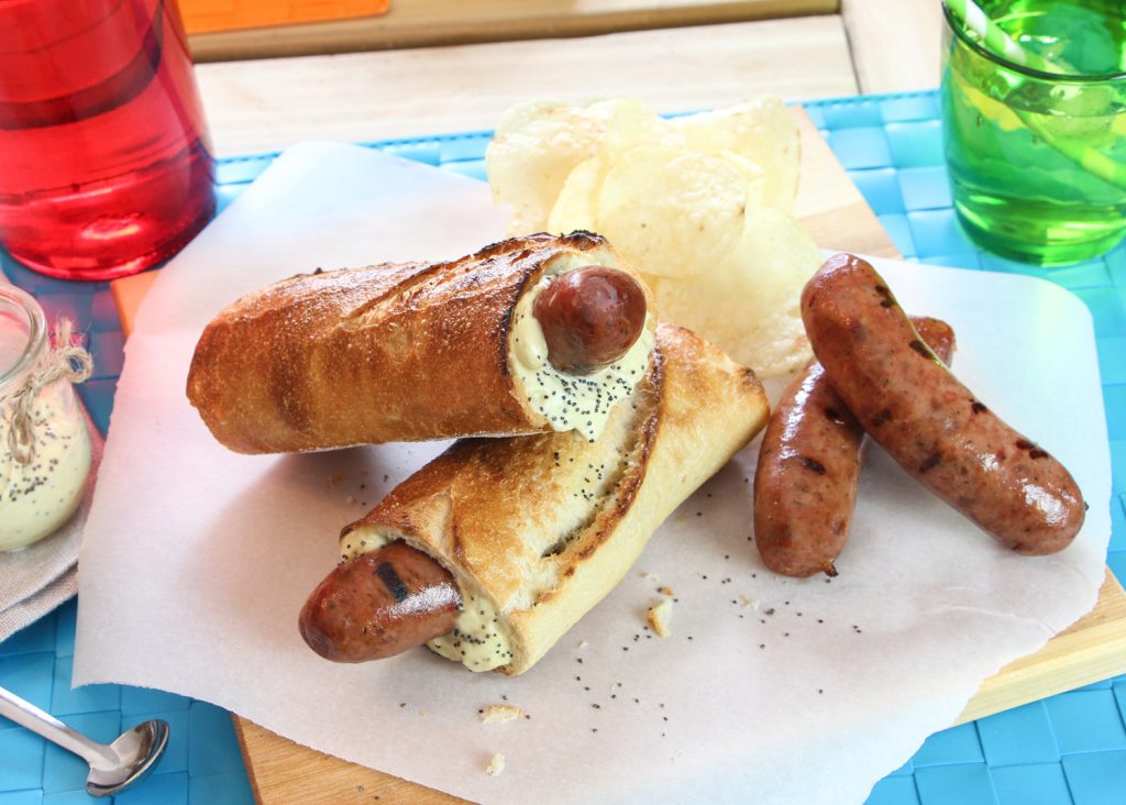 With a knife, spread the ginger-poppy dijonnaise on the inside of the baguette pieces (toasted or not). Add the sausages and serve immediately with additional ginger-poppy dijonnaise and potato chips.