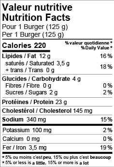 Cuire de l’état congelé. Sortir les galettes de leur pellicule plastique. Cuire sur le BBQ ou à la poêle à feu moyen environ 5 à 7 minutes de chaque côté ou jusqu’à l’atteinte d’une température interne de 74 °C (165 °F) au centre.