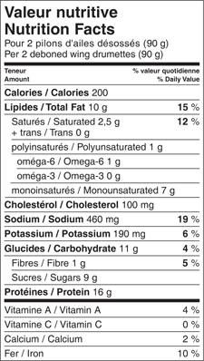 Pilons d’ailes de canard ● Sauce miel et ail [cassonade, eau, vinaigre, pâte de tomate (tomate)] ● Amidon modifié de maïs ● Miel en poudre ● Mélasse en poudre [maltodextrine] ● Sauce soya fermentée [soya, blé, sel de mer, épices, ail en poudre, gomme xanthane] ● Gras de canard ● Sel.