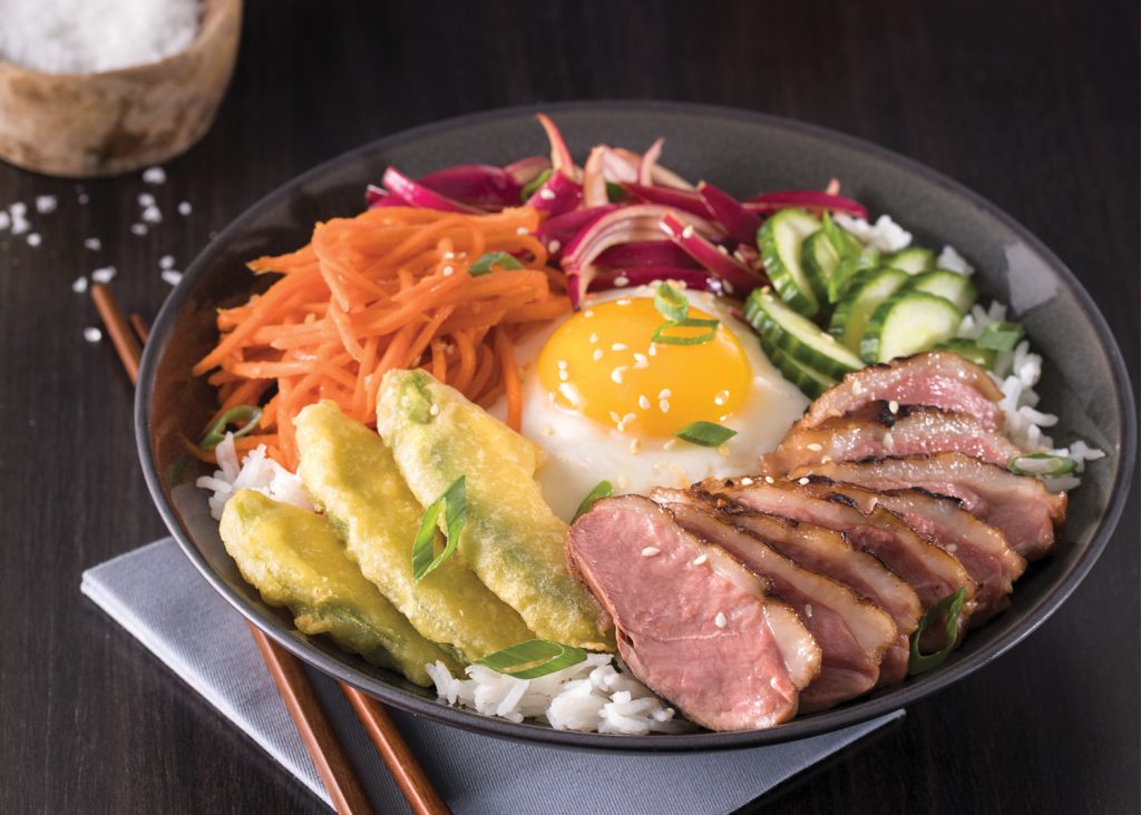 Dans quatre grands bols, répartir séparément le riz cuit, le canard, la carotte, l’oignon, le concombre et les avocats. Déposer un œuf dans chaque bol. Arroser d’un filet de la marinade réservée. Parsemer d’oignons verts et de graines de sésame.