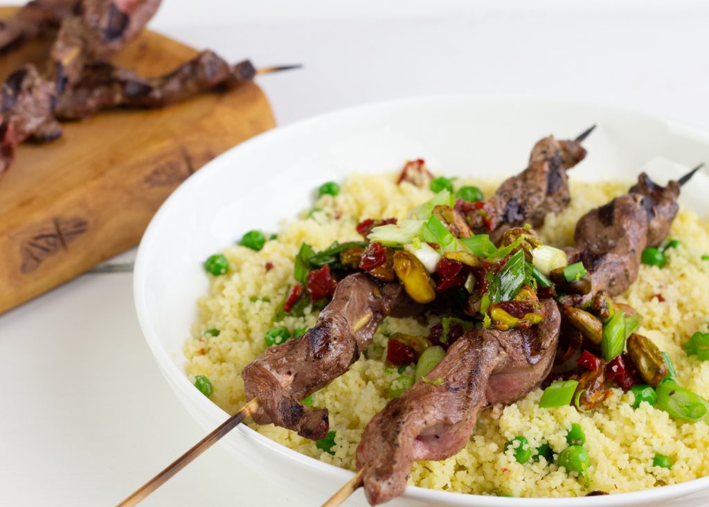 4. Les retirer du gril et servir immédiatement 1 à 2 brochettes par personne sur un fond de couscous et les napper généreusement de sauce aigre-douce aux pistaches et aux oignons verts.