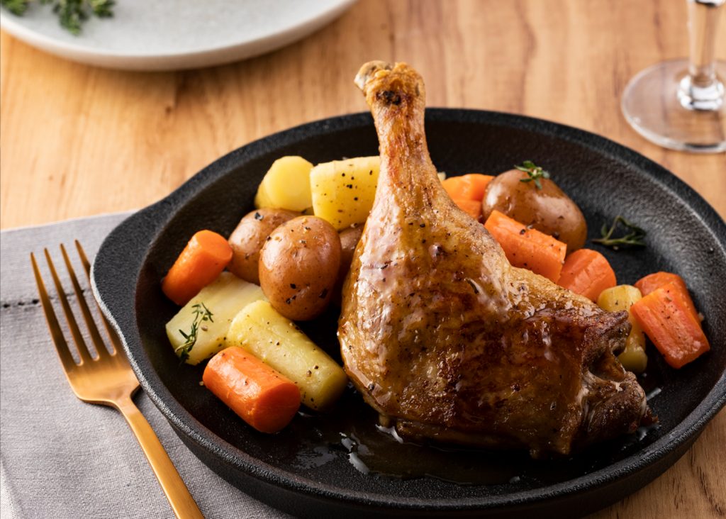 Servir les cuisses de canard et les légumes avec le bouillon.
