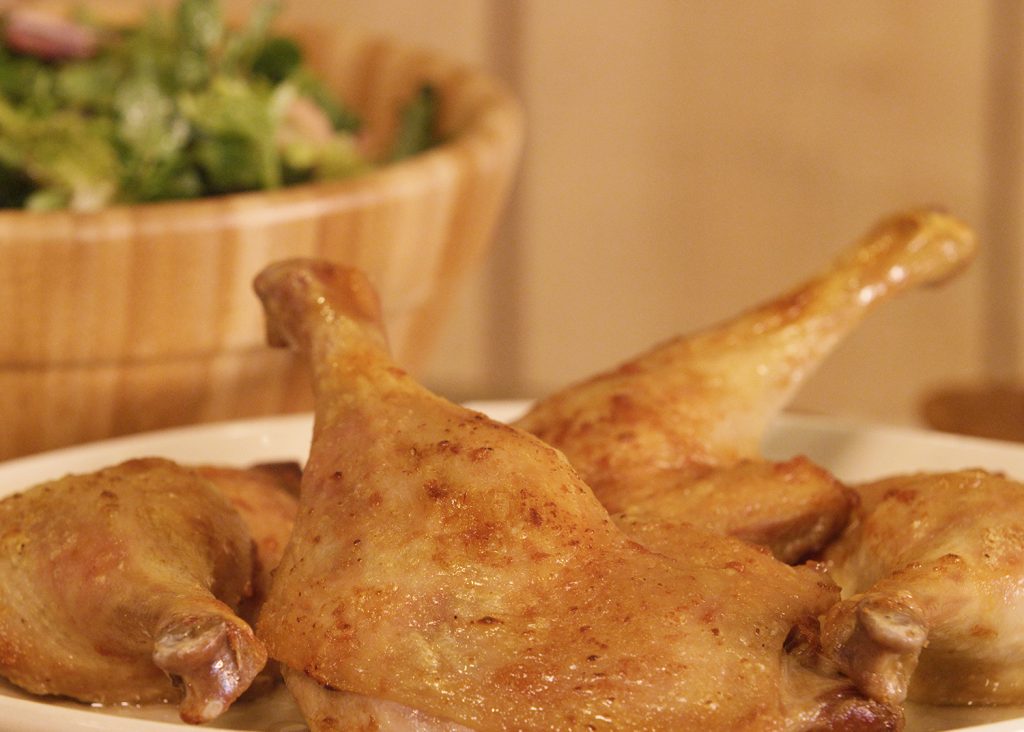 Placer les cuisses dans une cocotte ou un plat allant au four (idéalement de type Le Creuset). Assaisonner de sel et de poivre. Couvrir et cuire pendant environ 2 heures 30 minutes ou jusqu’à ce que la viande se détache de l’os.