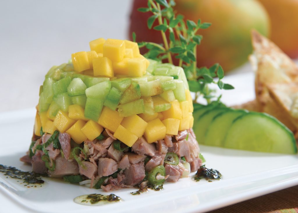 Déposer un peu de cheddar sur des quartiers de pitas et les gratiner quelques minutes à gril «broil». En déposer 1 à 2 par portion à côté des étagés, puis saupoudrer de graines de sésame. Décorer chaque étagé de quelques cubes de mangue réservés, puis servir immédiatement.