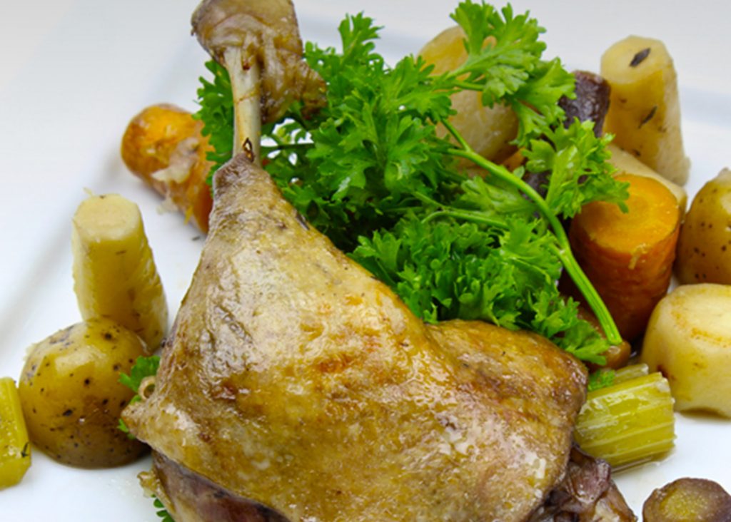 Sur la cuisinière, chauffer une cocotte ou un grand poêlon pouvant aller au four à feu moyen. Saisir les cuisses dans le gras de canard jusqu’à coloration, soit un minimum de 4 à 5 minutes de chaque côté. Réserver les cuisses dans une assiette, puis ajouter les légumes (carottes, oignon, gousses d’ail, céleri et échalotes, le tout coupé grossièrement). Colorer pendant 3 à 4 minutes.