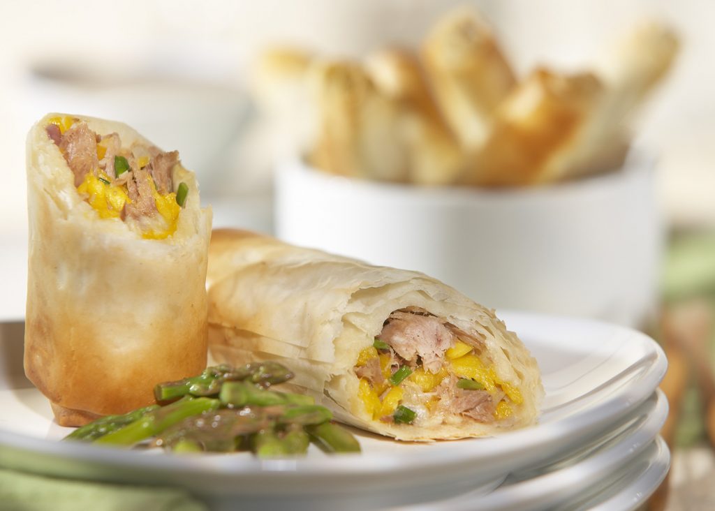 2. Pour chaque rouleau, superposer 3 demi-feuilles de pâte que vous aurez pris soin de badigeonner de gras de canard du Lac Brome fondu à l’aide d’un pinceau. Déposer une bonne cuillerée du mélange au centre des feuilles et former un petit rouleau en repliant bien les bords. Vous obtiendrez de 8 à 10 rouleaux. Une fois les rouleaux formés, les disposer sur une plaque à pâtisserie et les enfourner de 8 à 10 minutes à 200°C (400°F). Les rouleaux croquants au confit de canard du Lac Brome sont prêts lorsque la pâte phyllo est bien colorée. Servir avec une salade mesclun ou des légumes verts!