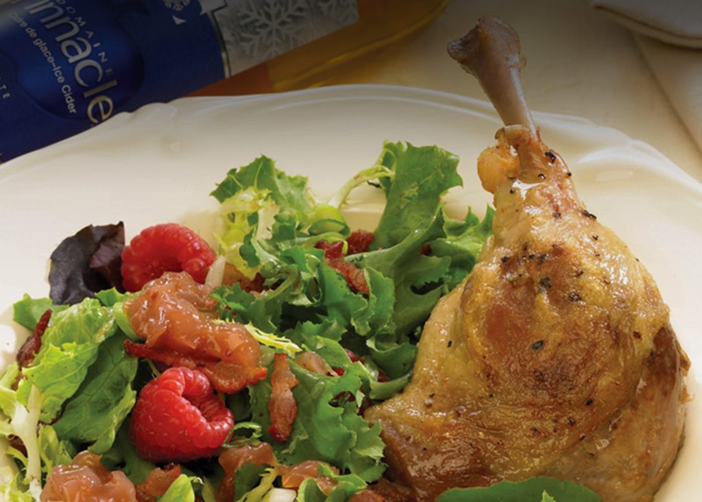 Retirer la poêle avec le confit du feu. Déposer une cuisse confite sur le côté dans chaque assiette de salade et répartir les lardons sur les cuisses. Garnir chaque portion d’une bonne cuillerée de réduction. Décorer chaque assiette avec 5 framboises. Servir immédiatement.