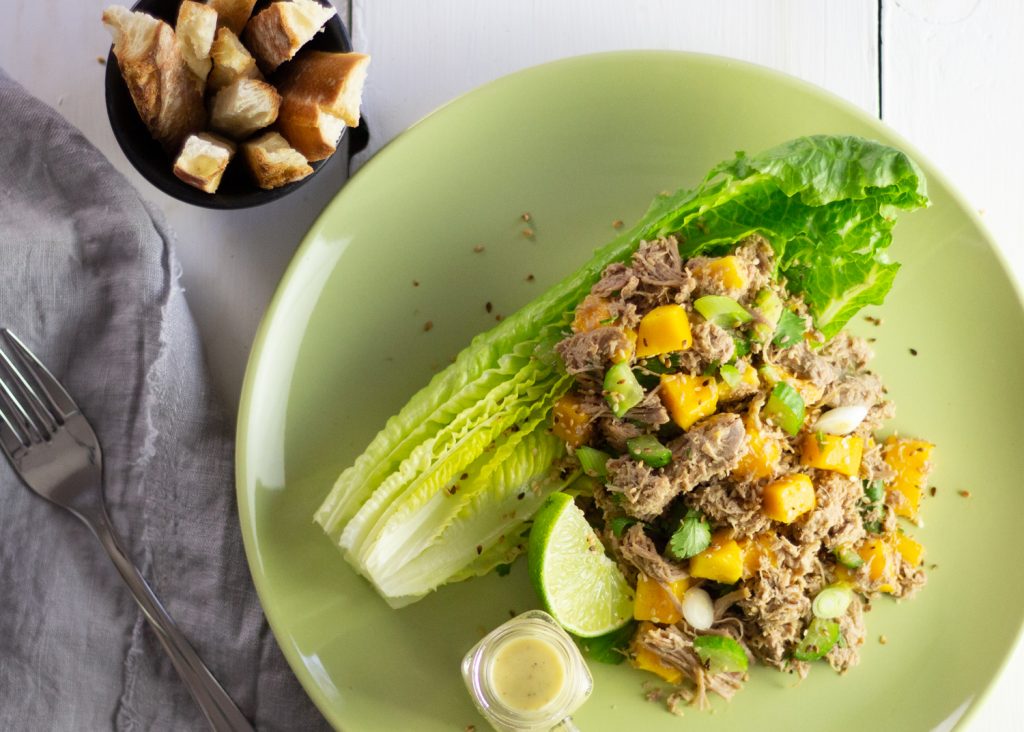 Disposer un demi-cœur de laitue dans une assiette et le recouvrir du quart du mélange de canard et de mangues. Garnir d’oignons verts et de graines de sésame. Mouiller d'un peu de vinaigrette dijonnaise à la lime et au cumin.