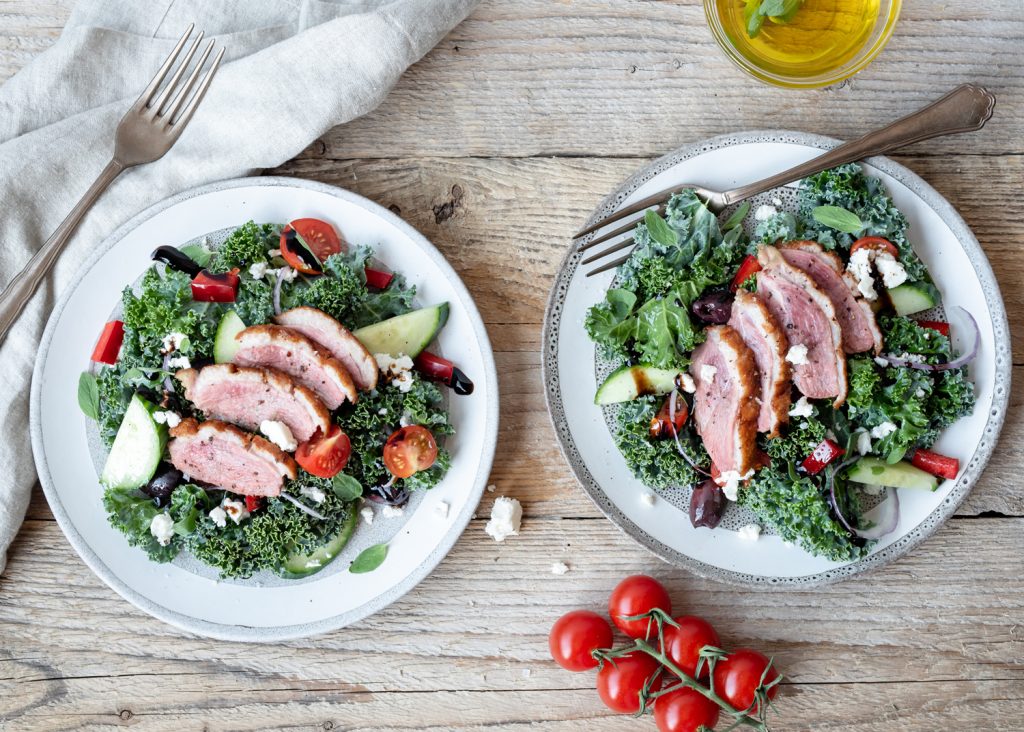 7. Couper la poitrine de canard en tranches d'environ 1 cm et déposer sur les salades. Arroser d’un filet d’huile d’olive et d’une généreuse portion de la réduction balsamique réservée. Ajouter un peu de poivre du moulin et de la fleur de sel si désiré.
