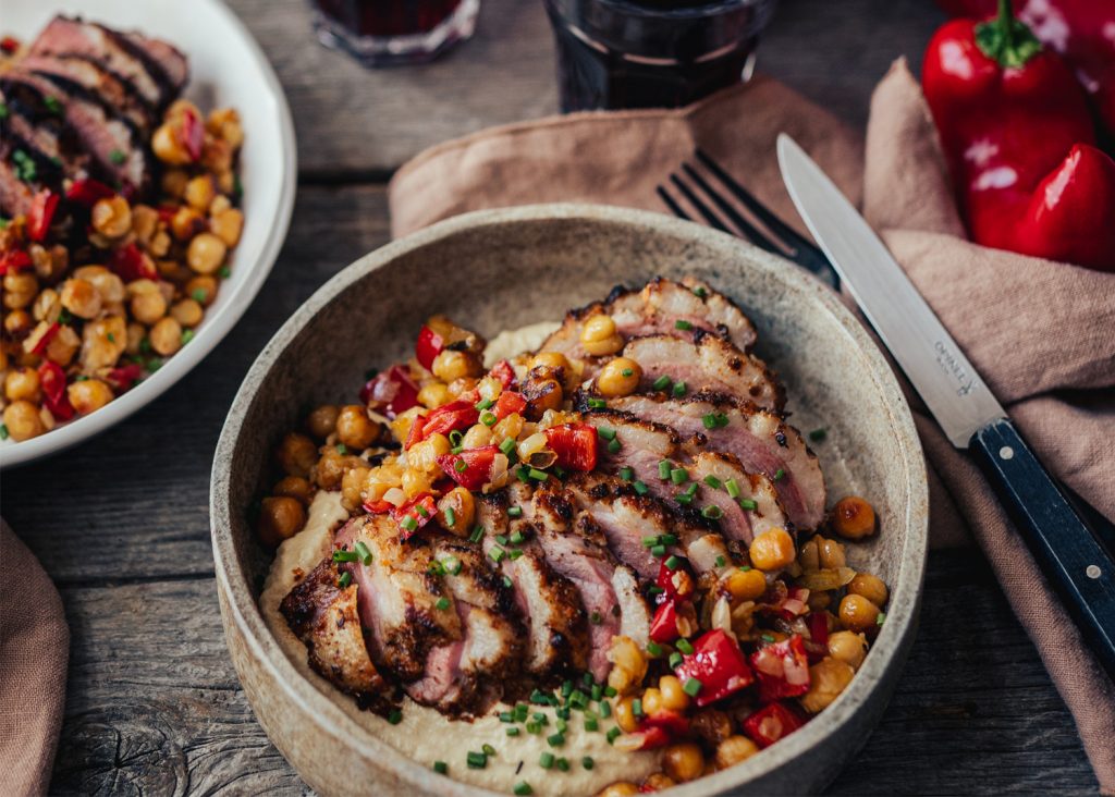 Steak de canard aux épices chipotle sur houmous, pois chiches et poivrons grillés