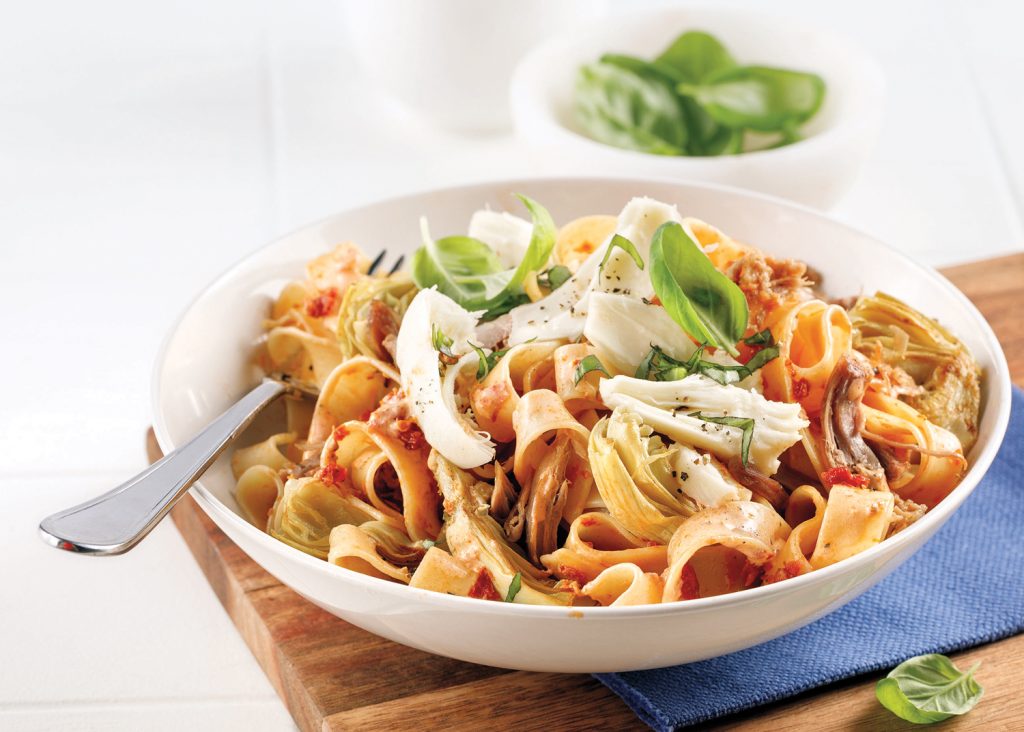 Ajouter les tagliatelles et les cœurs d’artichauts. Saler, poivrer et remuer.
